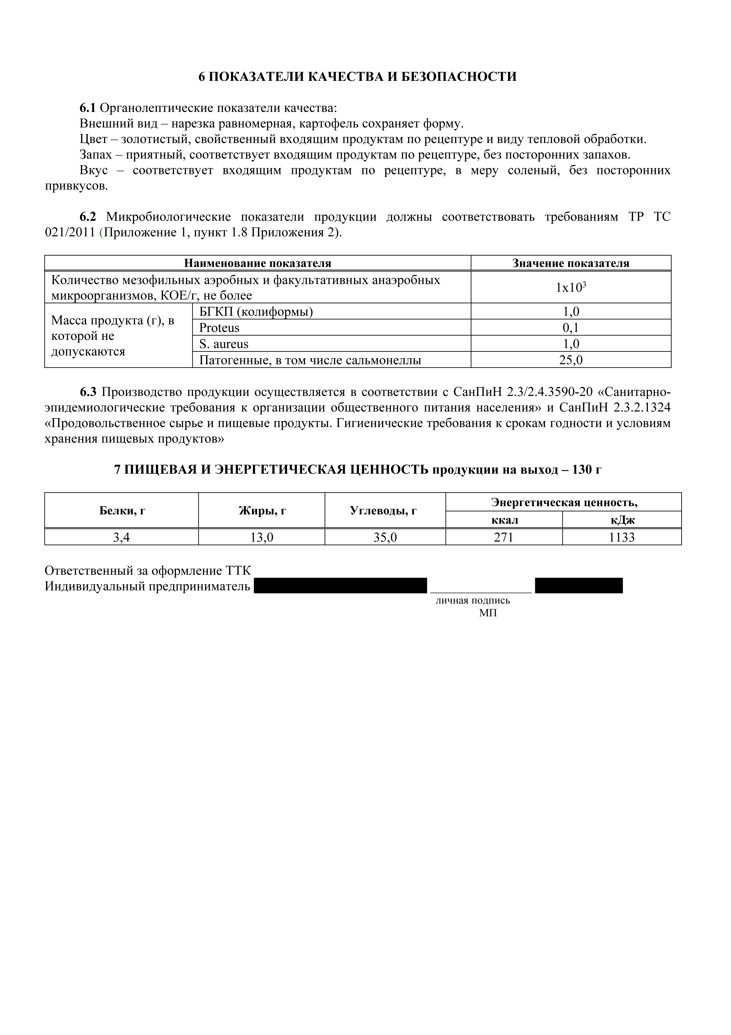 ТТК содержат рецептуру и технологию приготовления на продукцию, а так же требования к органолептическим, физико-химическим, микробиологическим показателям, расчет пищевой и энергетической ценности продукции.